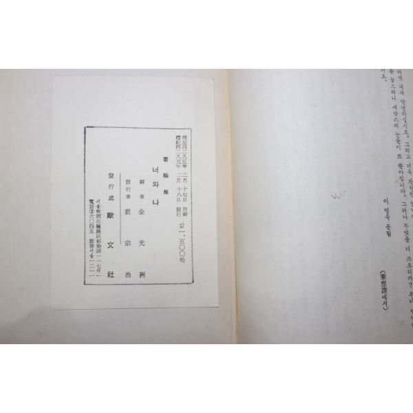 1962년초판 김광주(金光洲)편 서한집 너와 나
