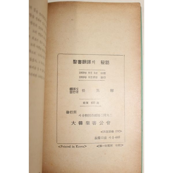 뒤로 1959년초판 임영빈(任英彬) 성서번역의 비화 > 근대도서