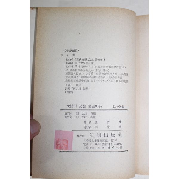 1976년재판 김후란(金后蘭) 수필집 태양이 꽃을 물 들이듯
