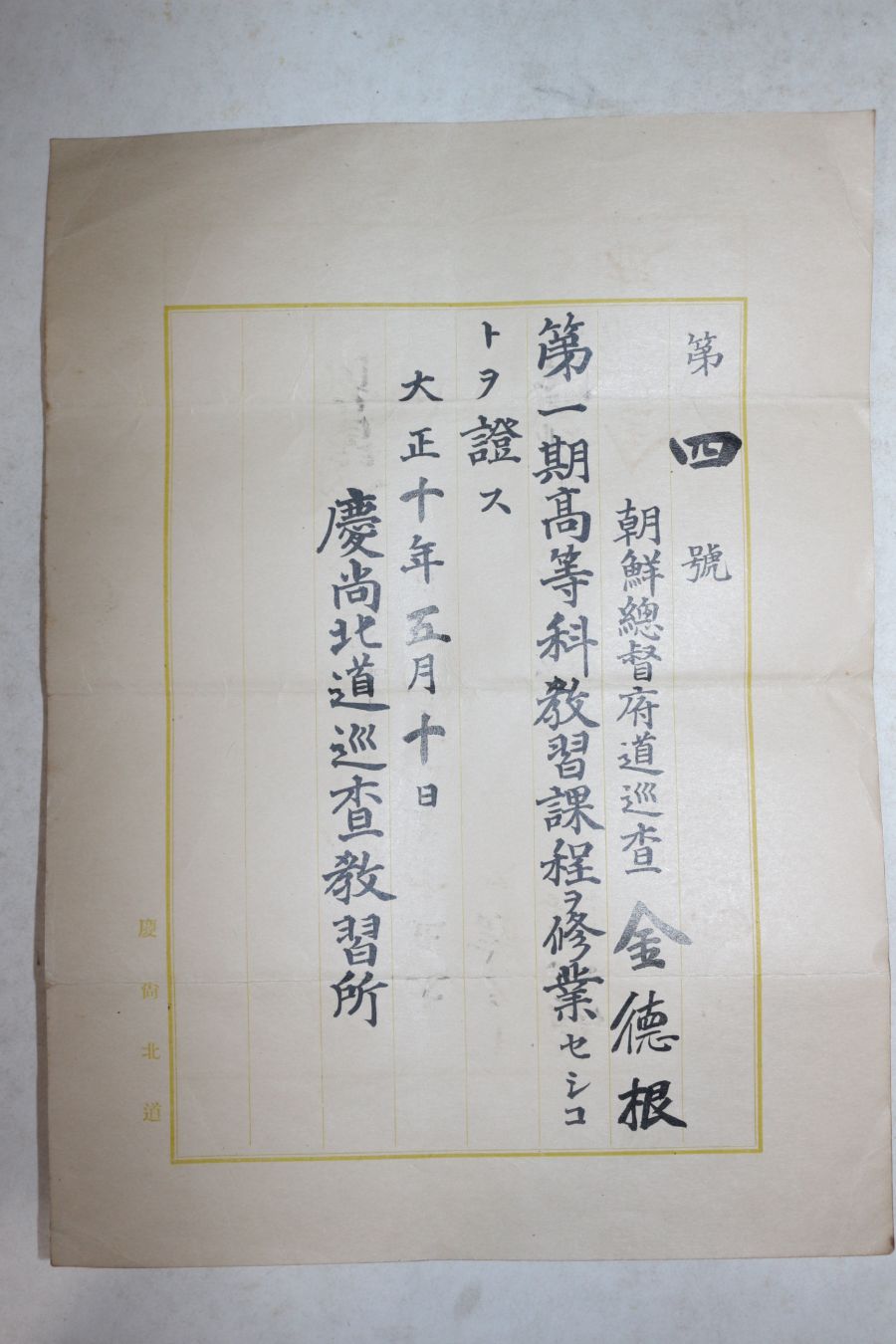 • 1921년(대정10년) 경상북도순사교습소 제1기 고등과교습과정수료증