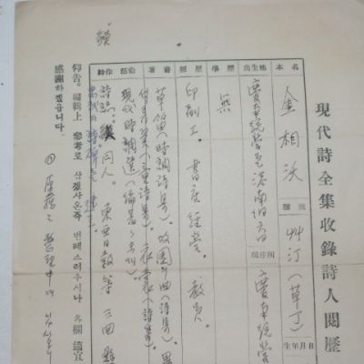 김상옥(金相沃)시인 친필약력,사진(근대)