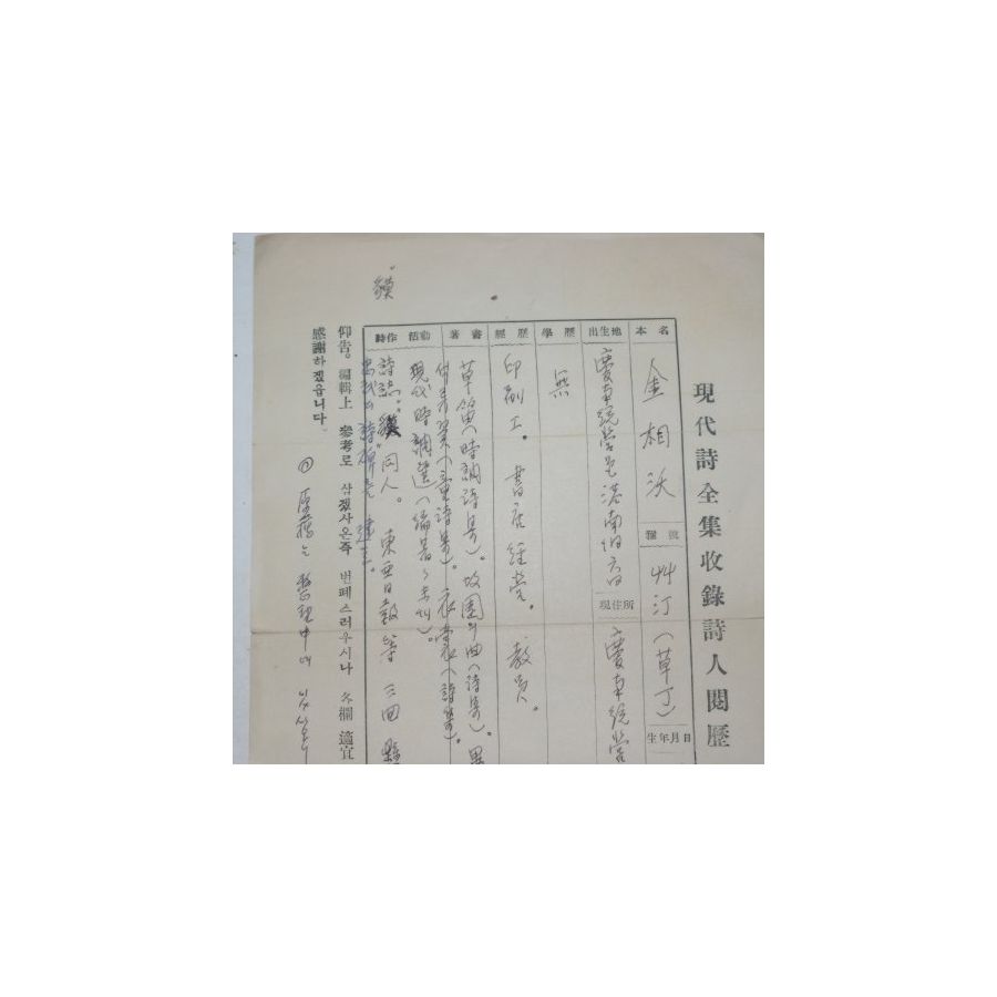 • 김상옥(金相沃)시인 친필약력,사진