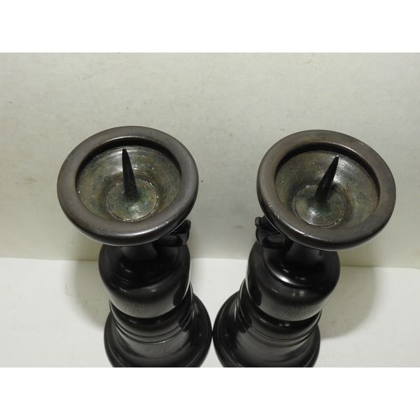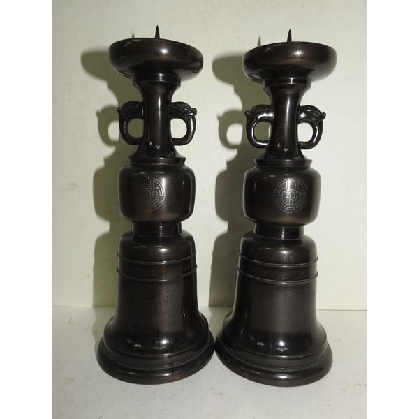 뒤로 묵직한 청동에 은상감화문된 촛대 1쌍 > 일본미술품