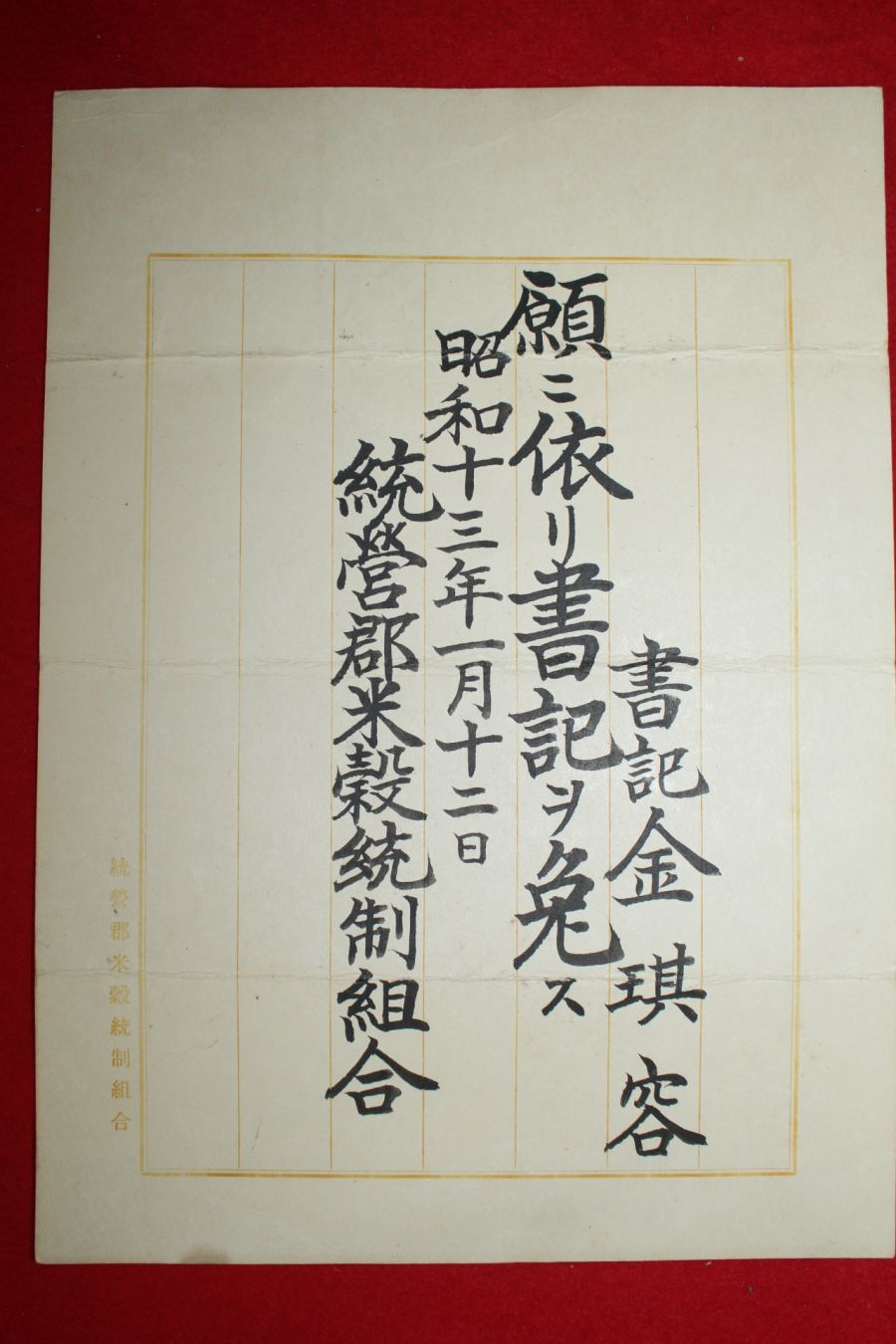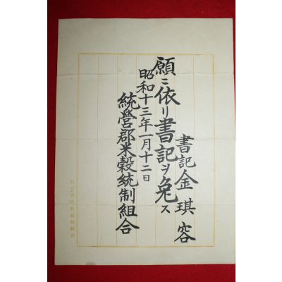 • 1938년(소화13년) 통영군미곡통제조합 서기 임명장
