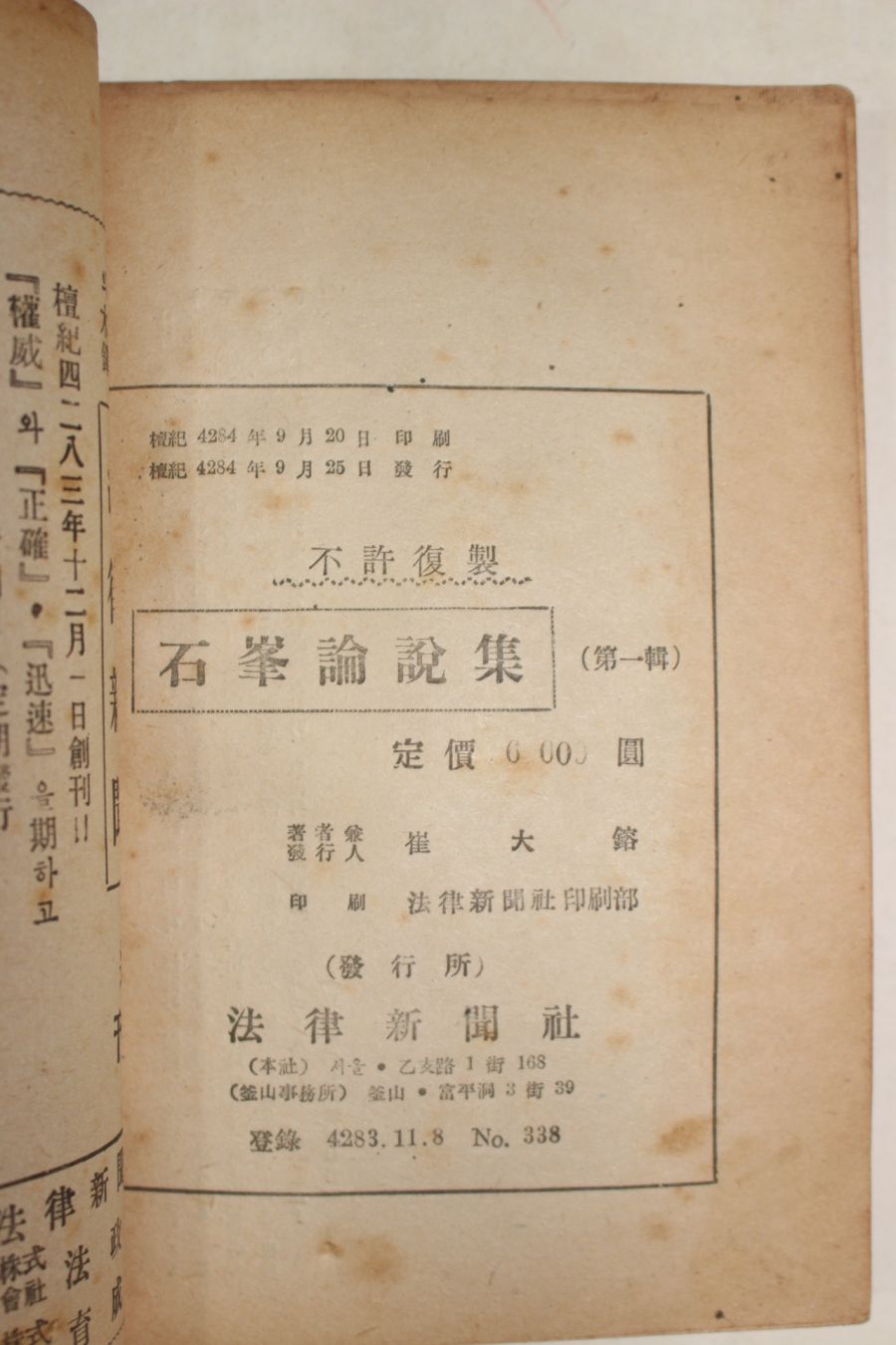 1951년초판 최대용(崔大鎔)편저 석봉논설집(石峰論說集) 제1집 > 근대도서