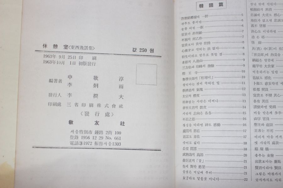 1963년초판 이형우(李炯雨)신경순(申敬淳) 동서일화집(東西逸話集) 휴게실(休憩室) > 근대도서
