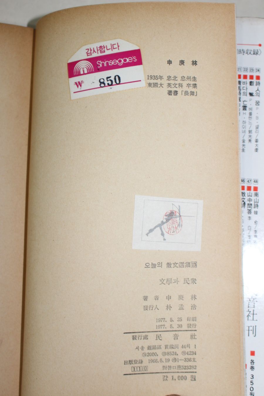 • 1977년초판 신경림(申庚林) 문한과 민중(文學과 民衆)