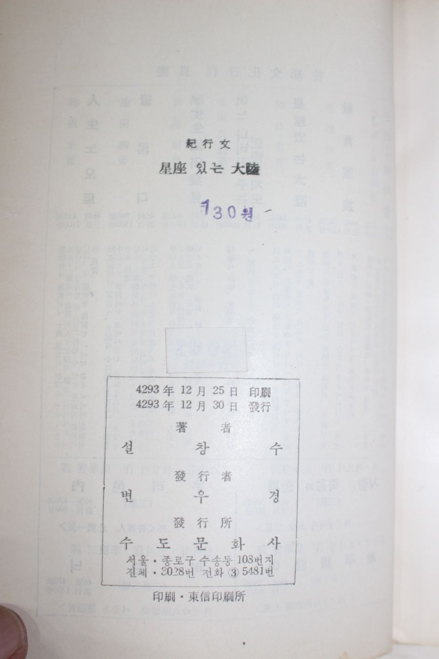 1960년초판 설창수 기행문 성좌있는 대륙(星座있는 大陸) > 근대도서