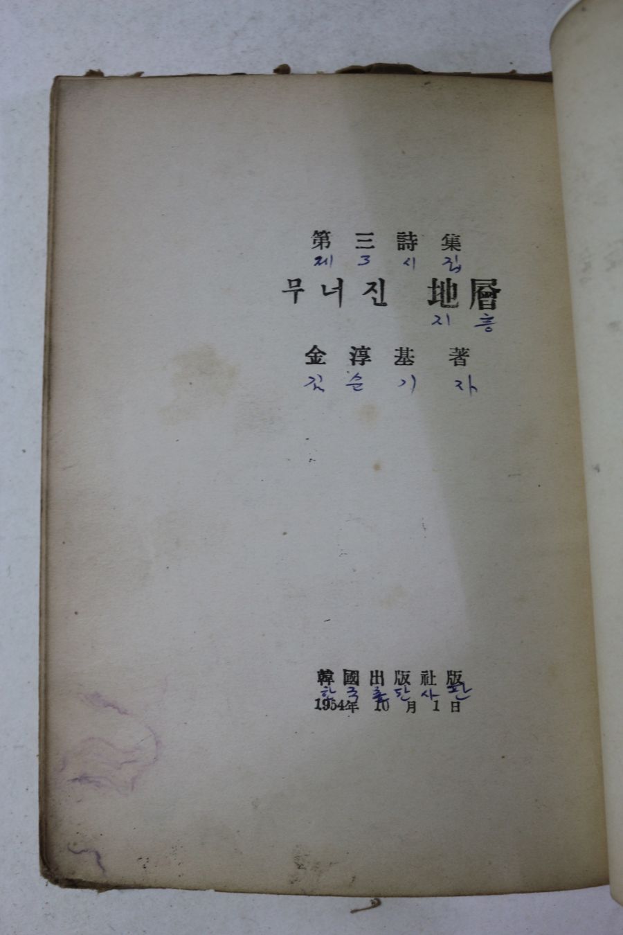 1954년초판 김순기(金淳基)시집 무너진 지층(앞표지 없음) > 근대시집