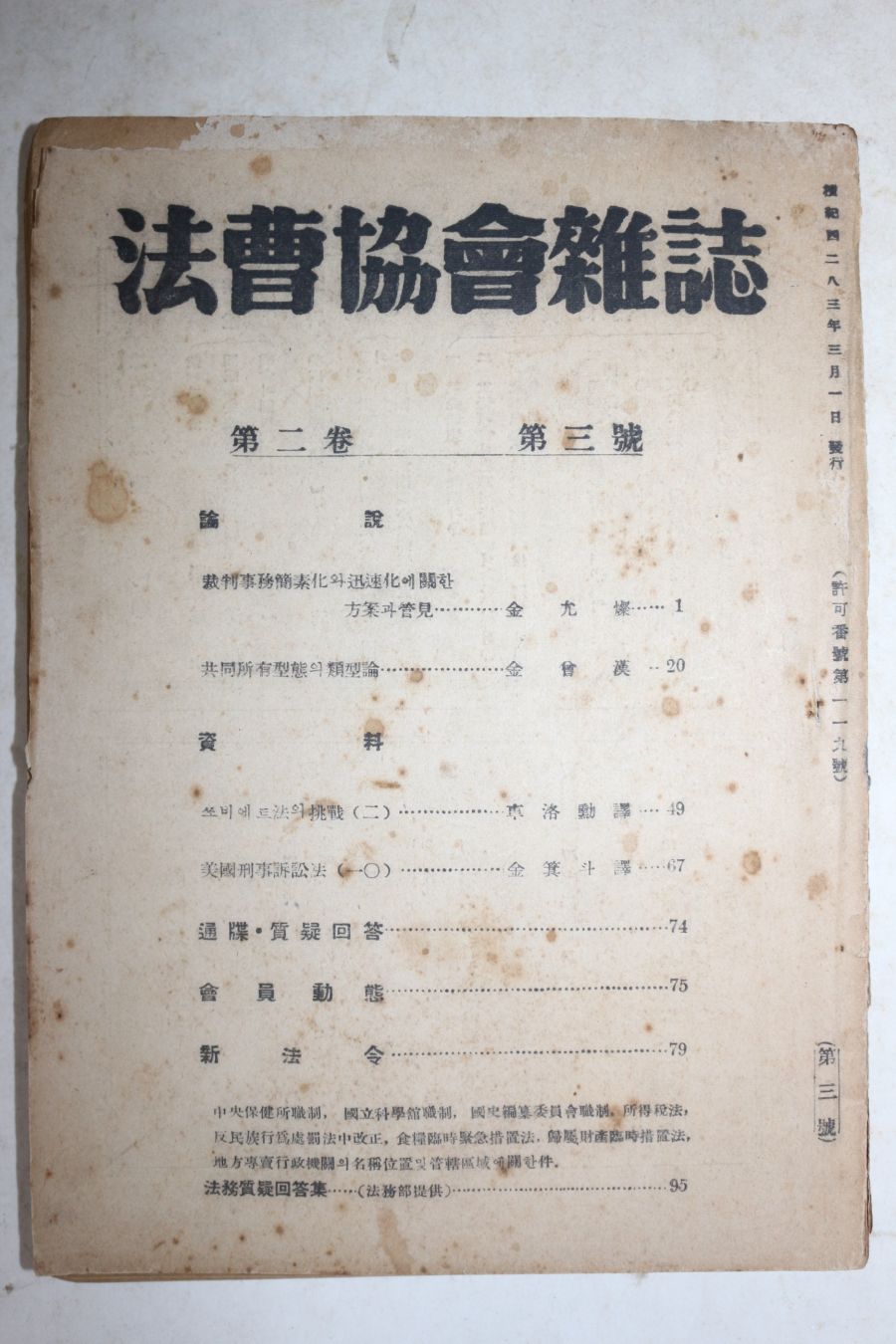 • 1950년 법조협회잡지(法曺協會雜誌) 제2권 제3호