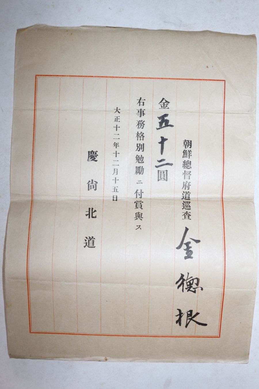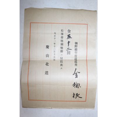 1923년(대정12년) 경상북도 조선총독부 도순사 김덕근(金德根) 포상증서 > 기타
