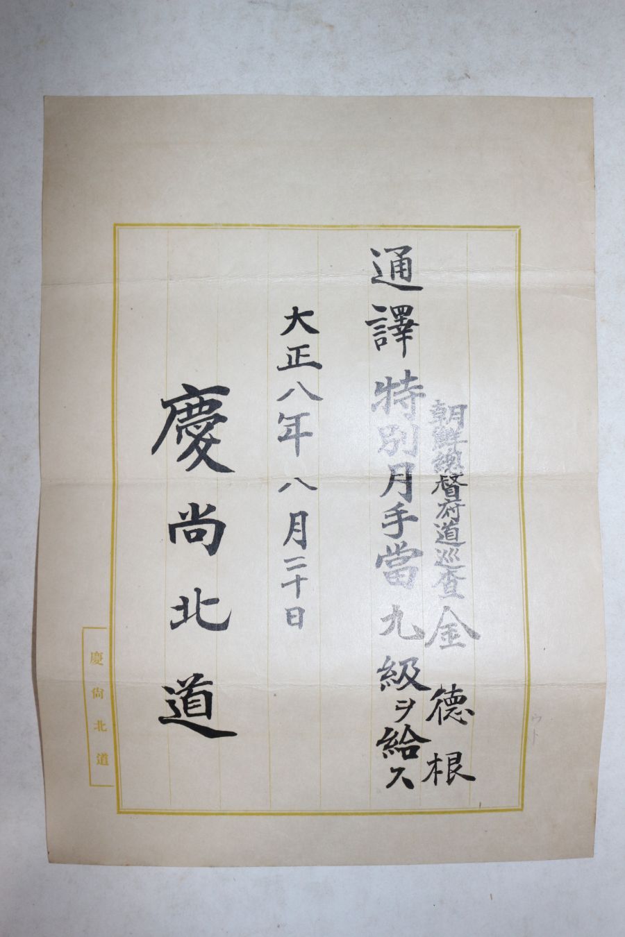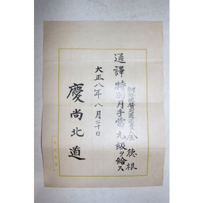 • 1919년(대정8년) 경상북도 조선총독부순사 김덕근 통역,월급수당 증서