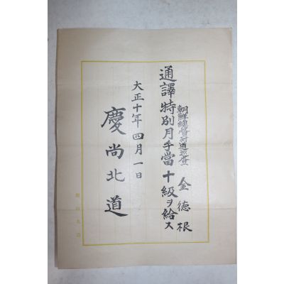 1921년(대정10년) 경상북도 조선총독부순사 김덕근 통역별월수당 증서 요약정보 및 구매