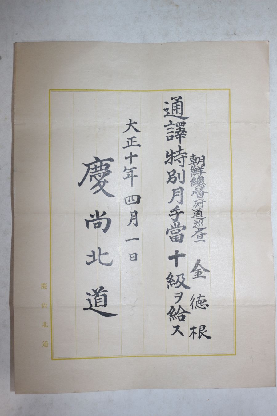 • 1919년(대정8년) 경상북도 조선총독부순사 김덕근 통역,월급수당 증서