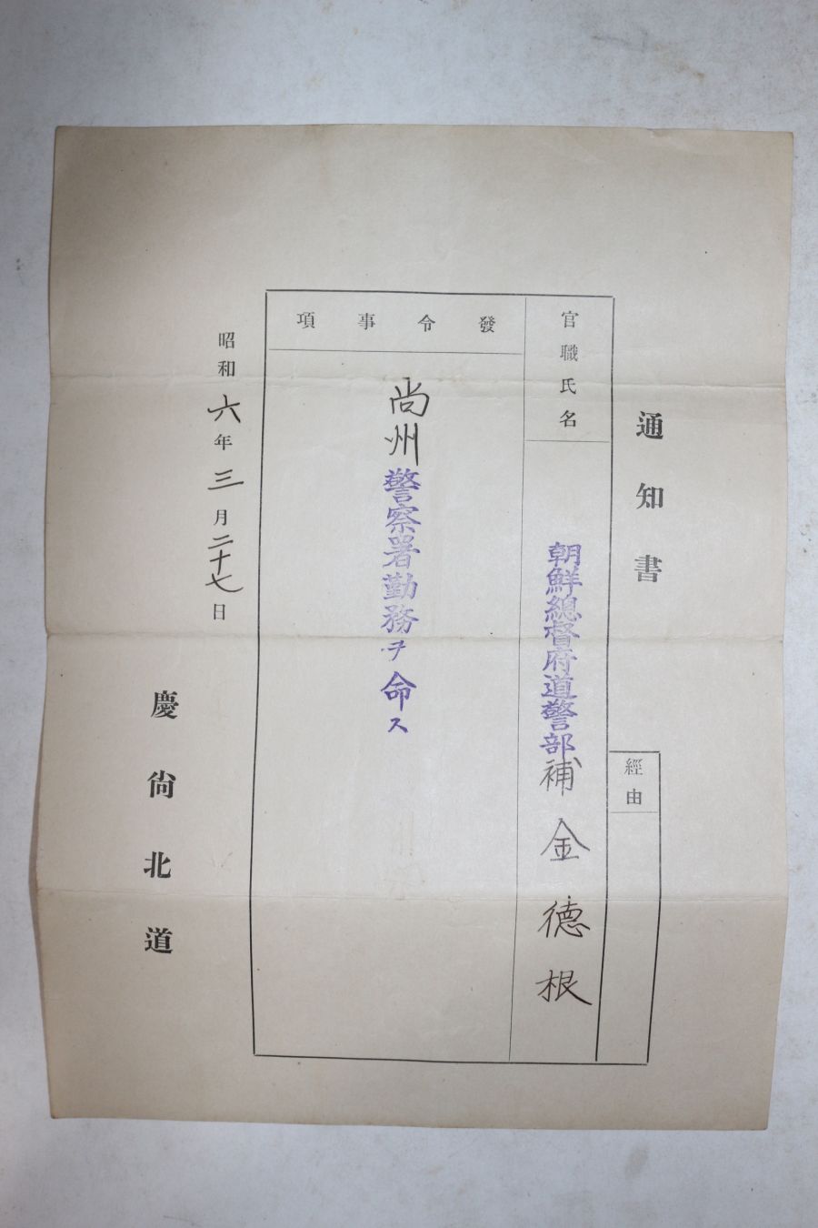 1931년(소화6년) 경상북도 조선총독부 도순사 김덕근 상주경찰서 발령장 > 기타