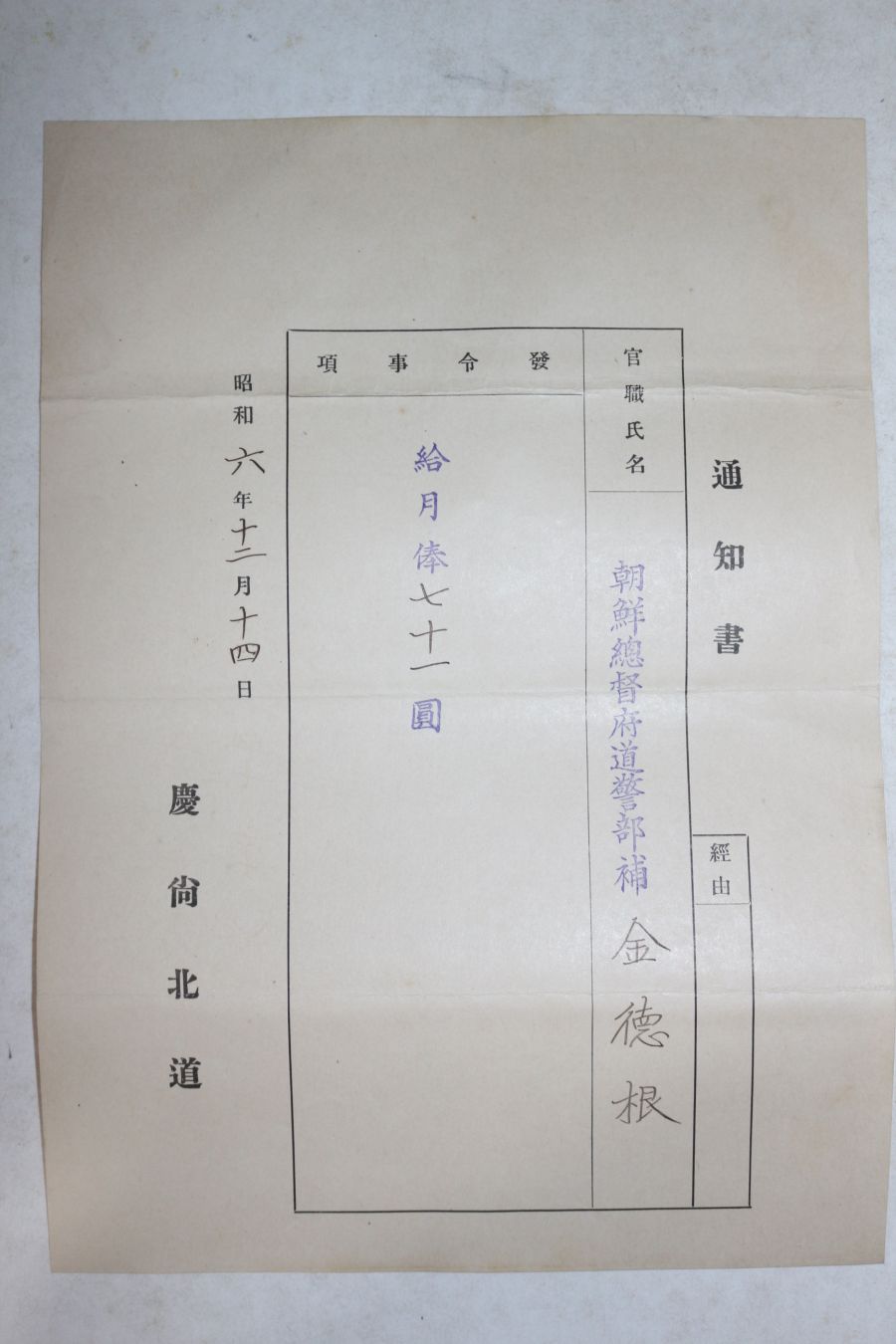 • 1931년(소화6년) 경상북도 발령서 통지서