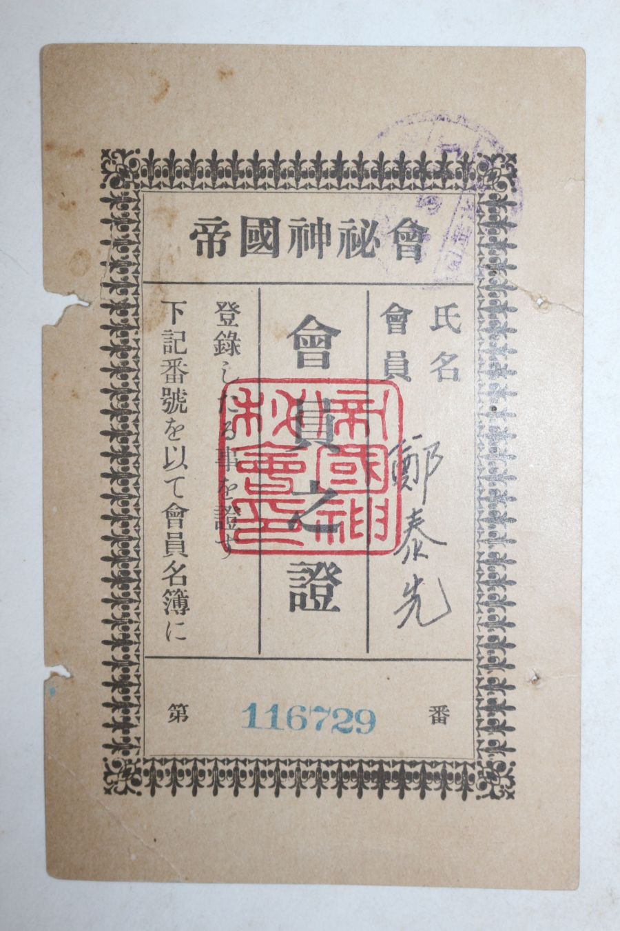 • 1936년(소화11년) 제국신비회 회원지증