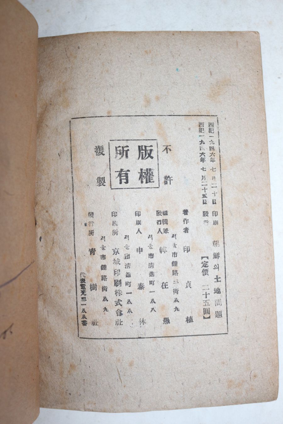• 1946년초판 인정식(印貞植) 조선의 토지문제(朝鮮의 土地問題)