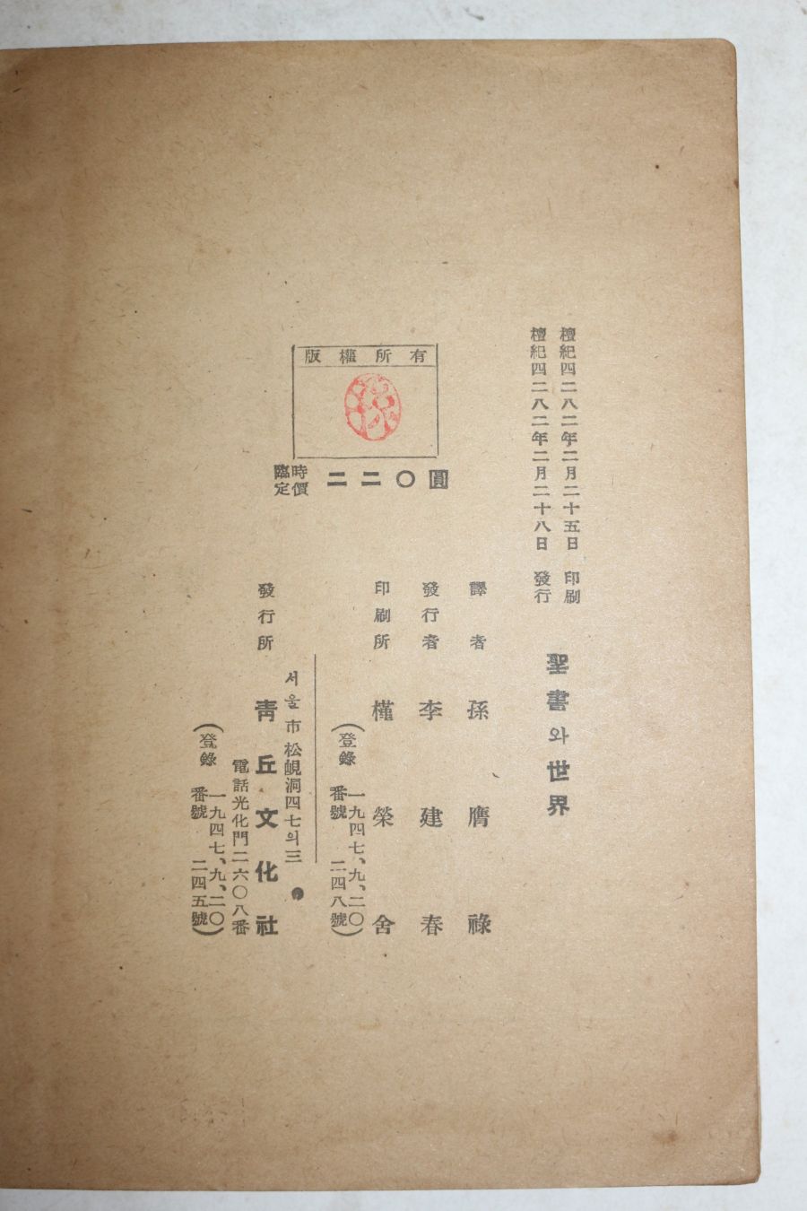 1949년(단기4282년)초판 손응녹(孫膺祿)역 성서와 세계 > 희귀고서적