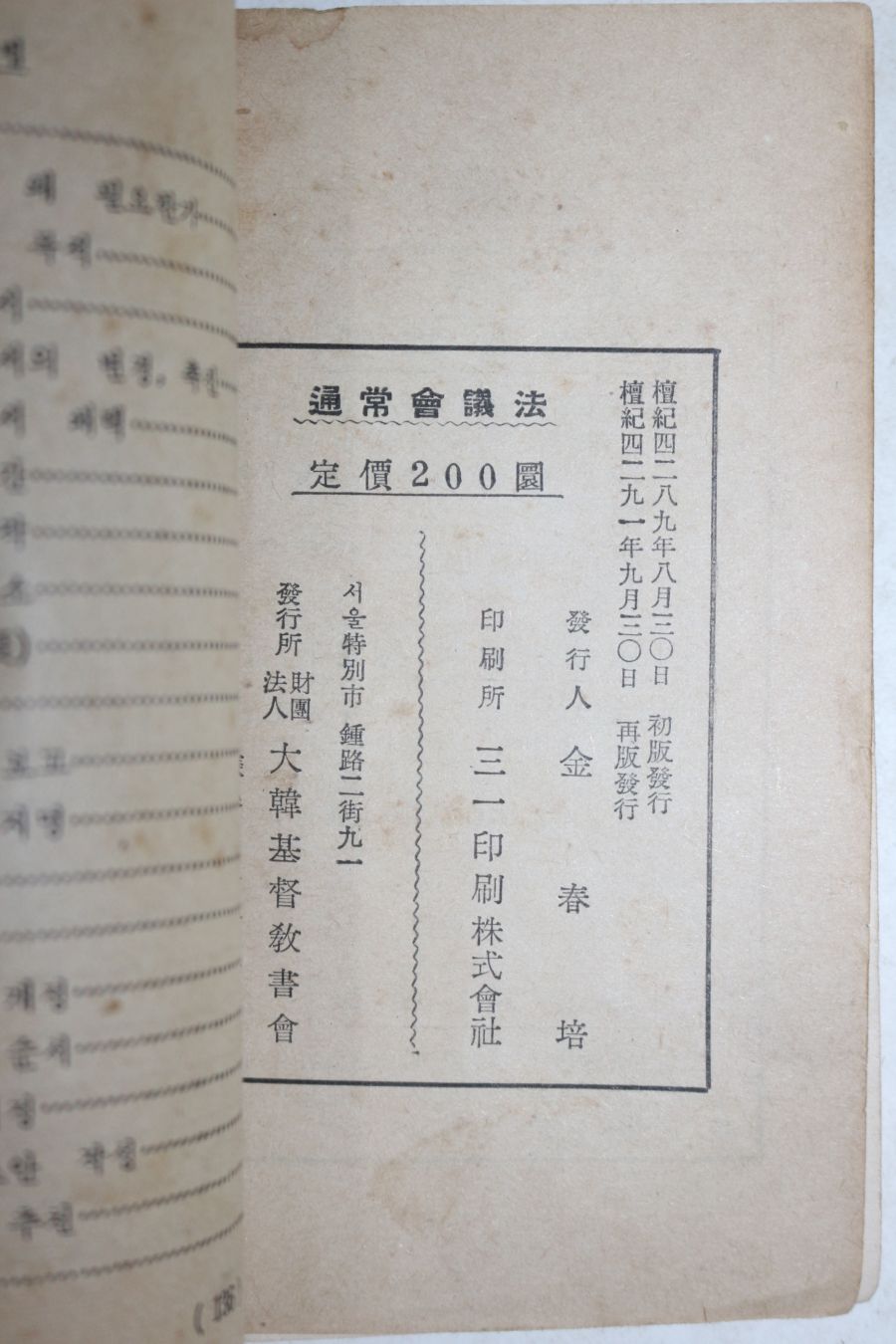 1958년(단기4291년) 대한기독교서회 안신영(安信永)편 통상회의법 > 근대도서